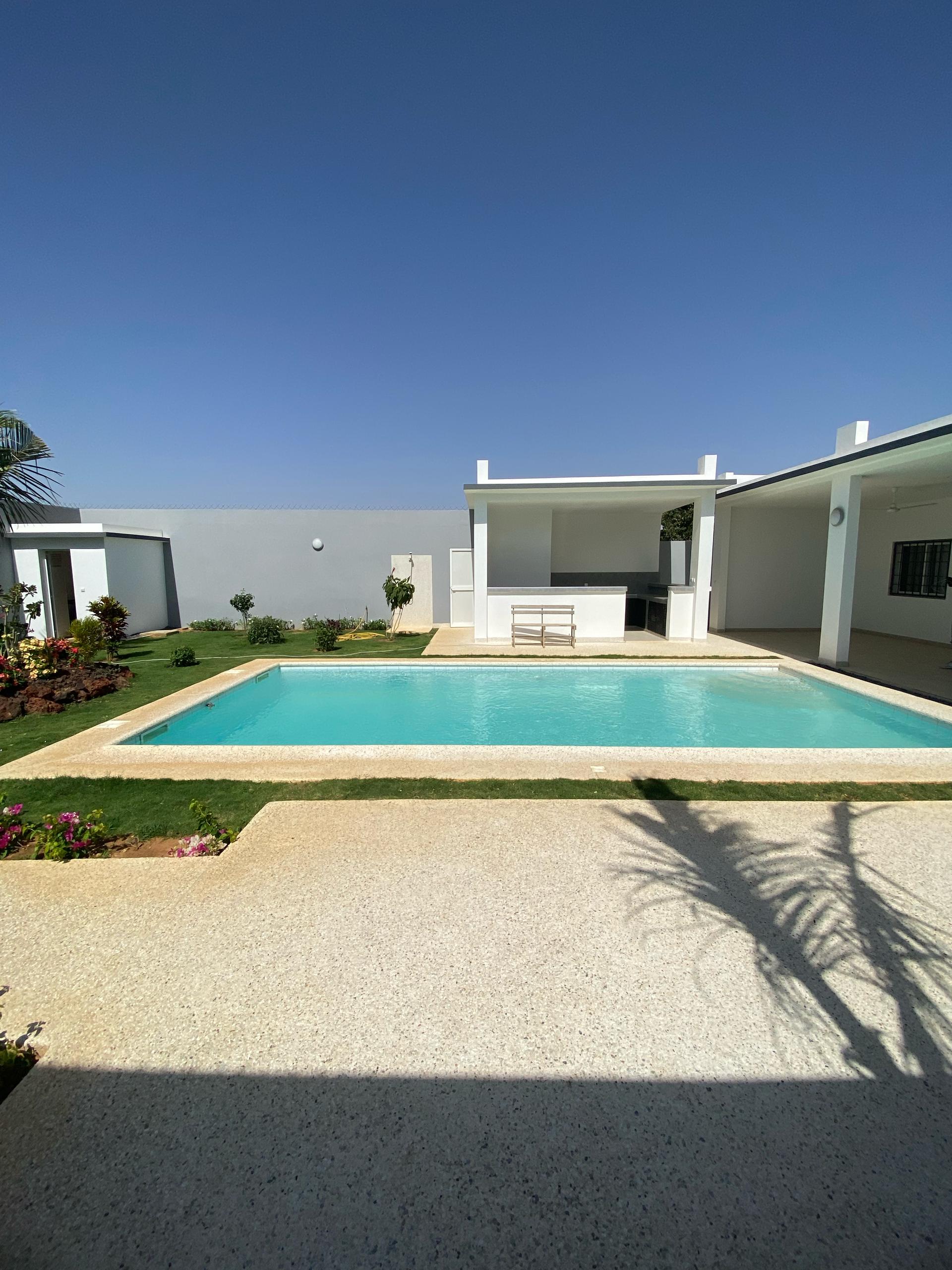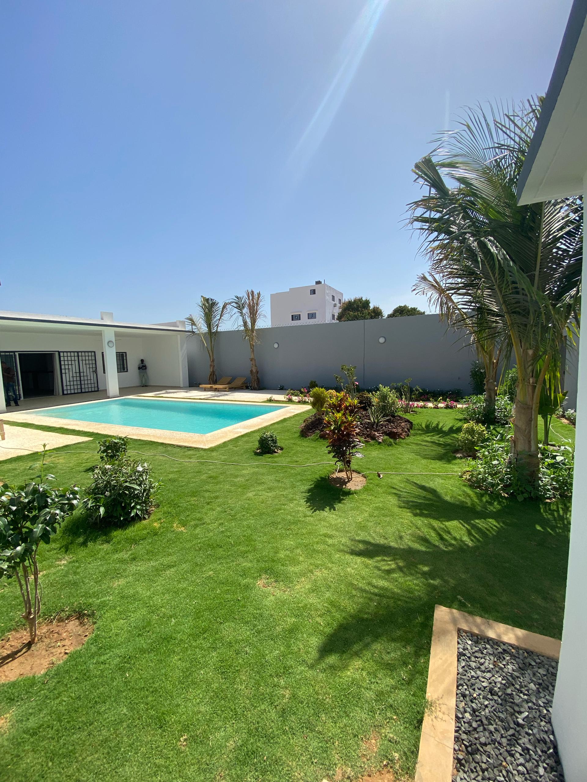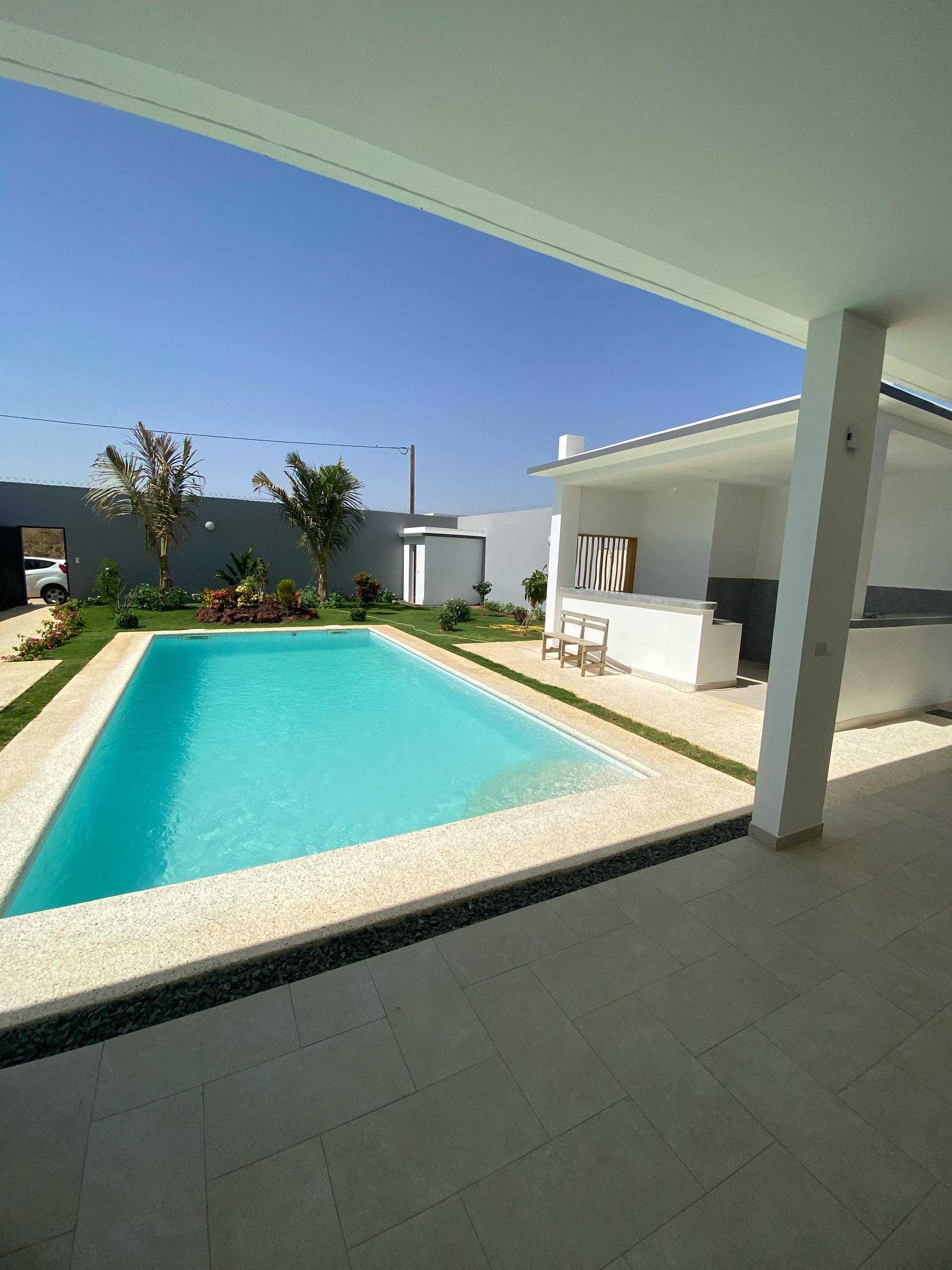 Ngaparou Villa de 600m² carrés de surfaces du terrains 3 chambres avec leurs salles de bains, salon, cuisine extérieure et intérieur, piscine, garage ouverte, prix 135 millions légèrement négociable papier délibération bail en cours